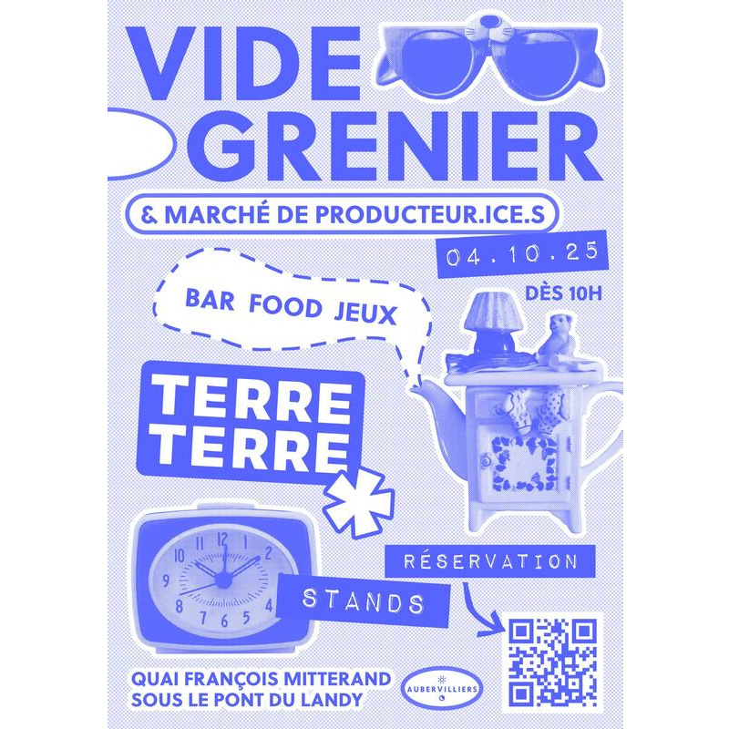 Lieu de la manifestation : - terre terre, 223 boulevard felix faure à aubervilliers - horaires d'ouverture au public du vide-grenier au public : 10h à 18h