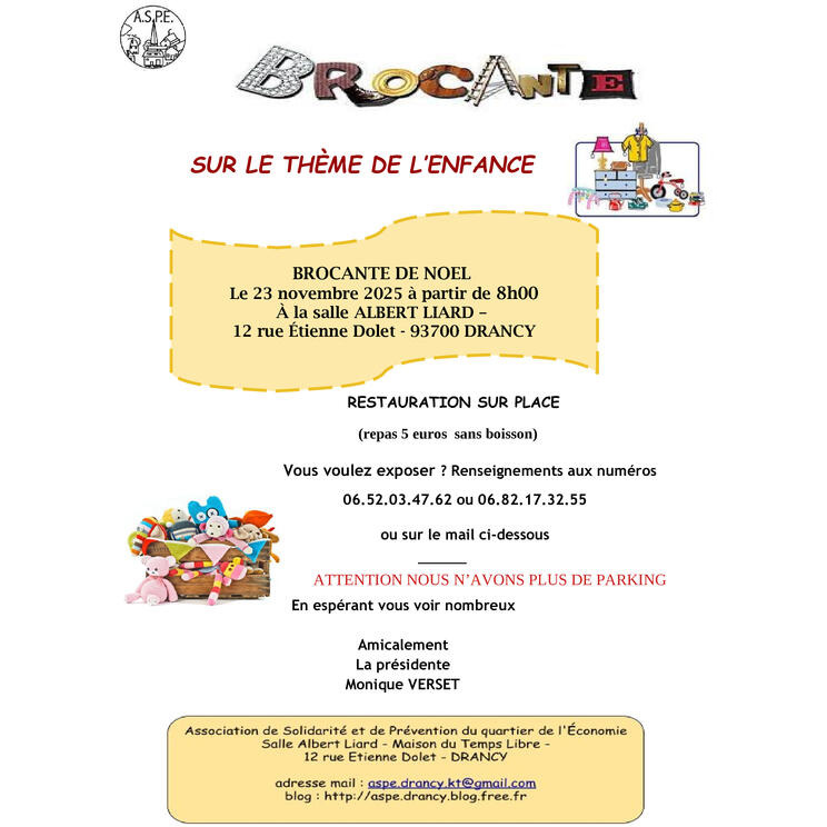 L'aspe organise sur le thème de l'enfance une brocante de noël. Vous y trouverez comme chaque année des jouets, livres et vêtements d'enfants. Vous pourrez aussi passer un moment conviviale autour d'un petit repas à 5 euros.