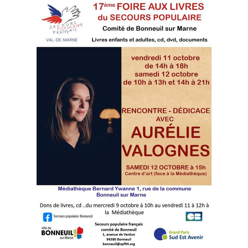 Des milliers de livres pour enfants et adultes,des cd et des dvd,des documents à des prix imbattables! Cette année une invitée aux millions de lectrices et lecteurs: aurélie valognes qui dédicacera ses livres le samedi 12 octobre à 15h.