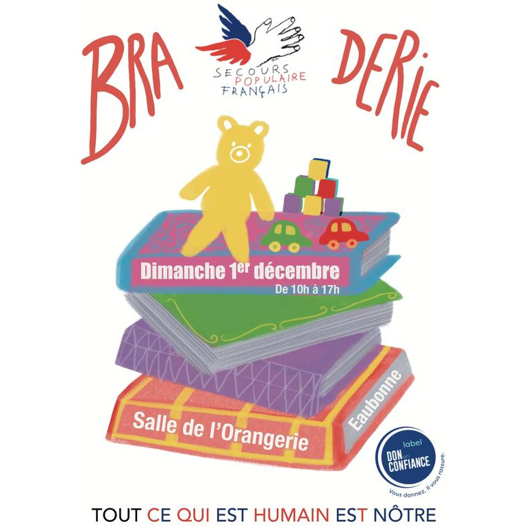 Depuis 1976, la campagne du père noël vert du secours populaire français ((https ://www.secourspopulaire.fr/qui-sommes-nous/campagnes/peres-noel-verts/) apporte aux familles en difficulté de quoi offrir des jouets et des livres neufs à leurs enfants. Comme tous les ans, le comité d'eaubonne propose une grande braderie de jouets et de livres d'occasion pour les enfants. Vous pourrez acheter à petit prix des objets de qualité et faire plaisir à vos enfants, en toute solidarité.
