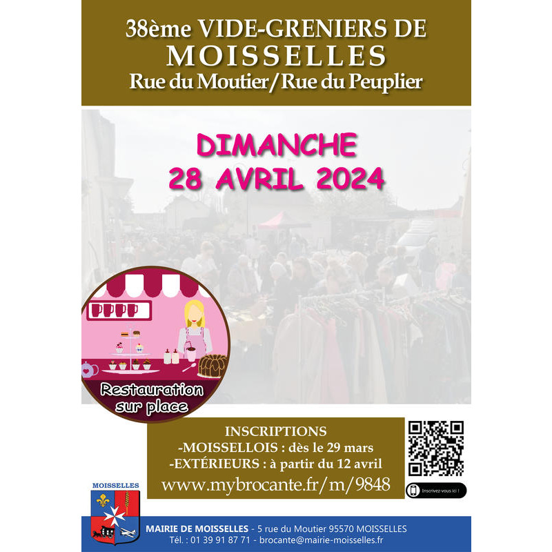 Le dimanche 28 avril 2024, la municipalité de moisselles organise son 38ème vide-greniers, avec le plaisir d’accueillir de nombreux exposants et visiteurs, particuliers et professionnels, venus de toute l’ile-de-france.