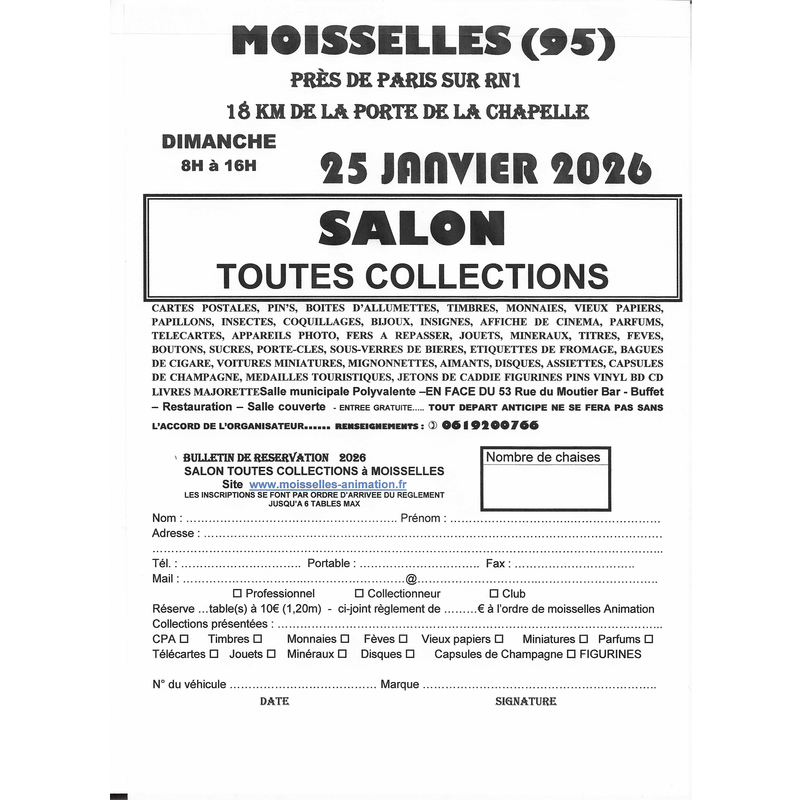 Le salon toutes collections est l'occasion de trouver la perle rare. Il est organisé par moisselles animation le dimanche 25janvier 2026 de 8h à 17h....