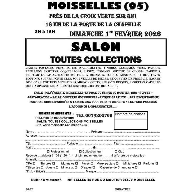 Le salon toutes collections est l'occasion de trouver la perle rare. Il est organisé par moisselles animation le dimanche 1er février 2026 de 8h à 16h....