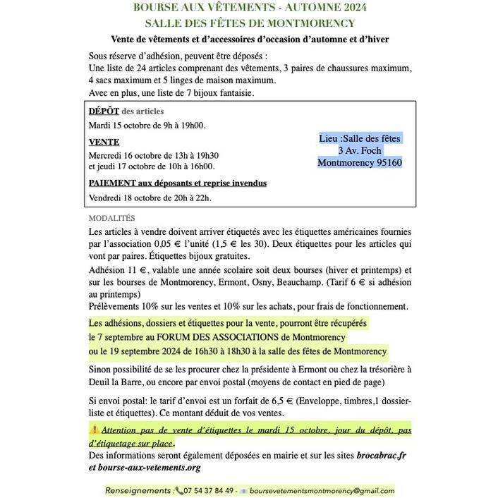 Vente d'articles vêtements, accessoires d'occasion, organisée par l'association. Les articles sont fournis par les déposants et la vente organisée par les bénévoles de l'association. Les vêtements sont déposés étiquetés avec les étiquettes fournies par l'association, sous réserve d'adhésion. Pas de stand individuels.