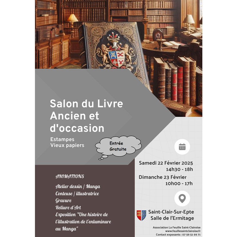 Des animations auront lieu pendant le salon : gravure, reliure, présence d'une conteuse / illustratrice, exposition "une histoire de l'illustration, de l'enluminure au manga"... ...