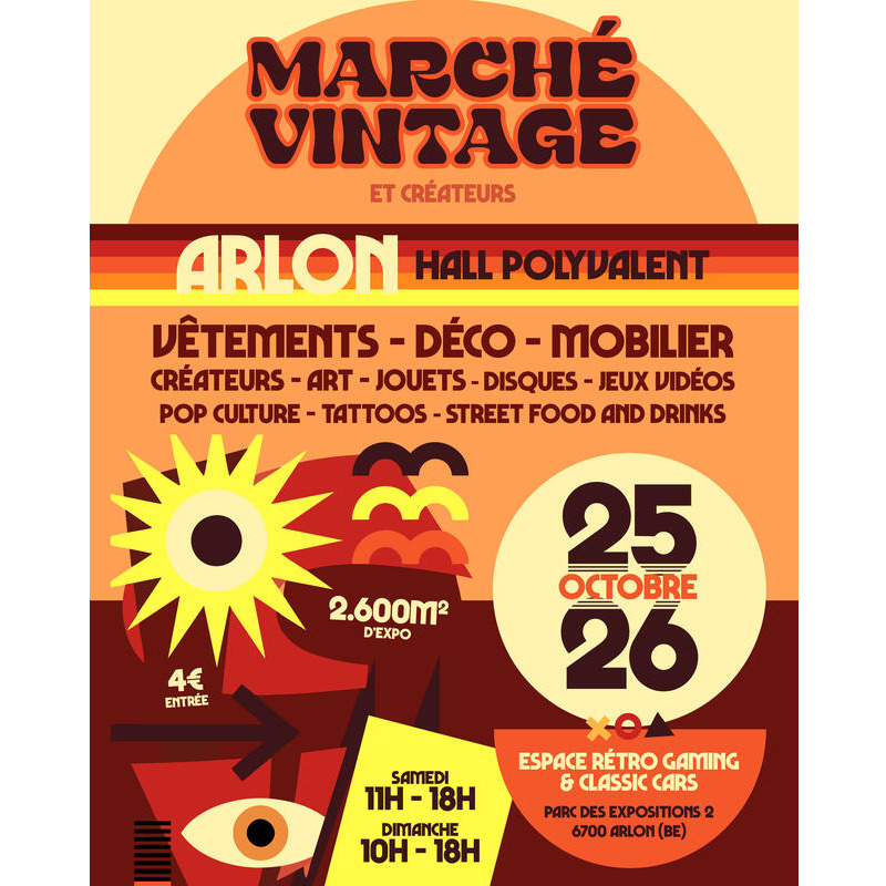 On vous donne rendez-vous au hall polyvalent d’arlon, à deux pas de la frontière luxembourgeoise et française, pour 2600m² de vrai vintage. Un week-end exceptionnel placé sous le signe des années 60 à 2000 : vêtements, déco, mobilier, jouets, pop culture, vinyles et bien plus encore.