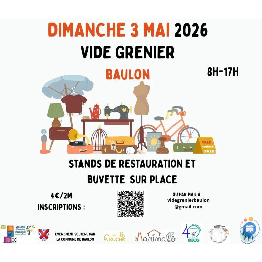 Manimalô, l’OGEC Sainte Marie, Gym à Baulon, la ludothèque et Cent pour un toit Vallons de Haute Bretagne, en partenariat avec la municipalité de Baulon, relancent le vide-grenier !