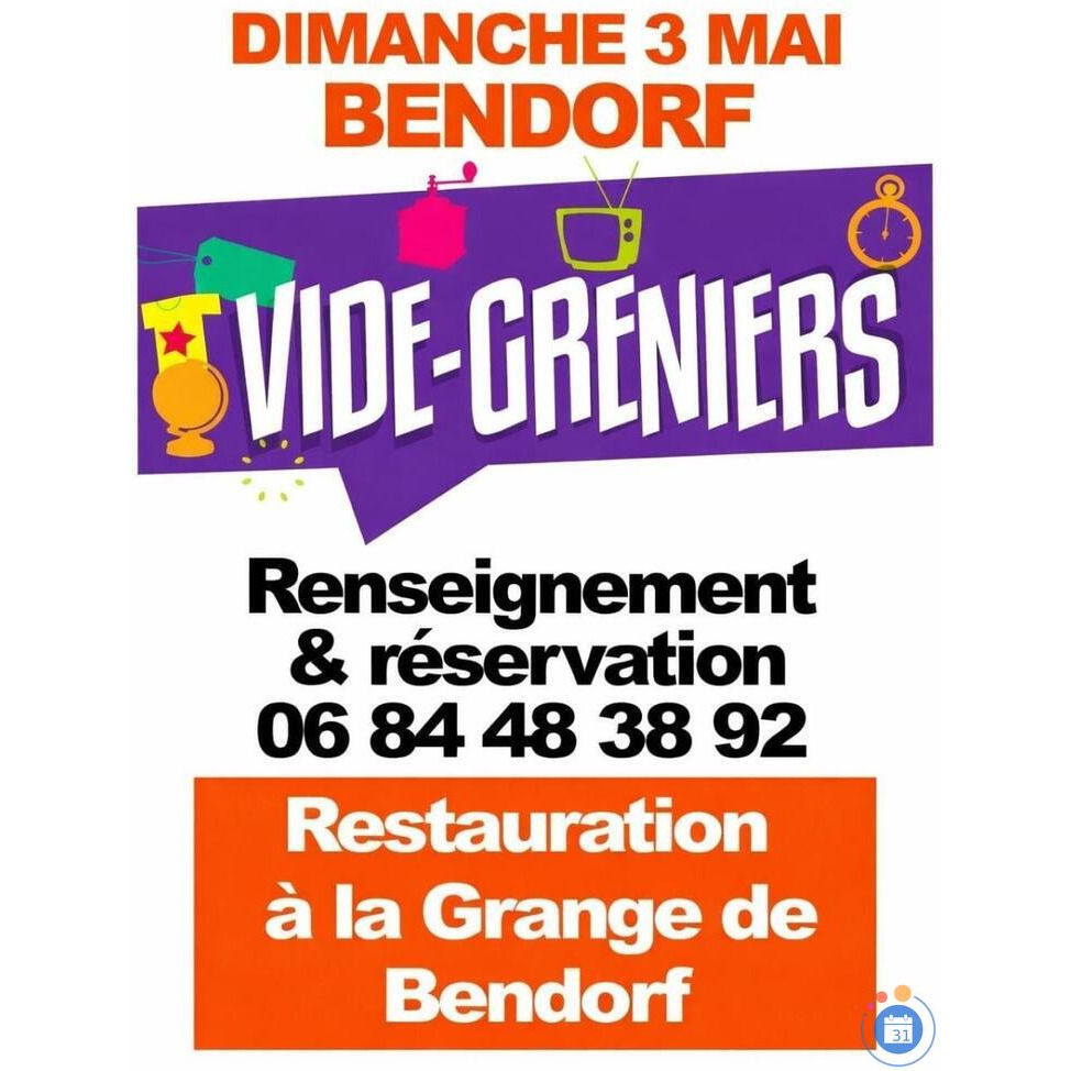 Vide greniersAlsace - Haut-Rhin - Bendorf - De 7h à 17h Modalités du vide-grenier : Le prix de l’emplacement est fixé à 15 € pour 5 mètres linéaires. Les numéros d’emplacement seront attribués à partir de 6h30. Le début de la vente est prévu à 7h00. Passé 8h00, les emplacements non occupés seront réattribués. L’inscription se fait via le lien ci-joint