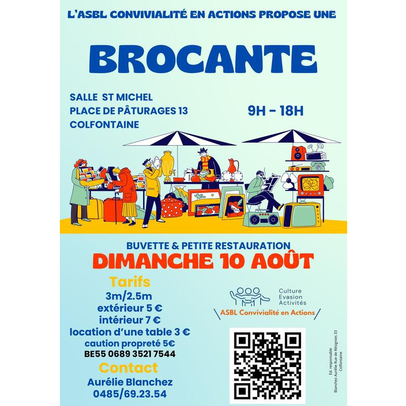 L’asbl convivialité en actions organise une brocante le dimanche 10 août de 9h à 18h à la salle saint-michel 13, place de pâturages à colfontaine.