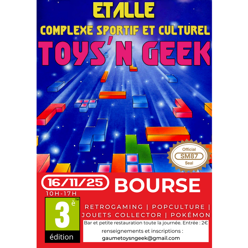 Toys'n geek 3ème édition , plongez dans l'univers des jouets rétro et geek ! Amateurs, nostalgiques ou fan des années 80-90 , la troisième bourse de collectionneurs organisée par le mini-foot de sainte-marie 87 revient pour votre plus grand plaisir. Date: 16/11/25 heure: 10h à 17h00 lieu: complexe sportif et culturel , 82a rue des ecoles b-6740 etalle rejoignez nous pour une expérience unique qui ravira les fans de toutes générations. Redécouvrez des trésors du passé et des , le tout dans une ambiance conviviale et passionnée. Ce que vous pourrez trouver : consoles et jeux vidéo rétro et actuels jouets de collection et objets vintage cartes à collectionner : pokémon, magic et bien plus articles de pop culture, comics et films ....Et d'autres surprises à venir que vous soyez un collectionneur chevronné ou simplement curieux, ce salon est l'endroit parfait pour trouver des trésors uniques et rencontrer d'autres passionnés. Ce sera l'endroit idéal pour un cadeau de fin d'année original. Cosplayers bienvenus ! Venez en costume et ajoutez encore plus de magie à cet événement ! Bar et petite restauration tout au long de la journée partagez cet événement avec vos amis, réservez la date et préparez-vous à vivre une journée découverte ou redécouverte à la toys'n geek 3 ! Entrée : 2€ pour toute question ou demande d'emplacement pour les exposants, veuillez nous contacter sur le messenger de cette page facebook ou à l'adresse mail . À bientôt ! Le comité et membres du mini-foot sainte-marie 87