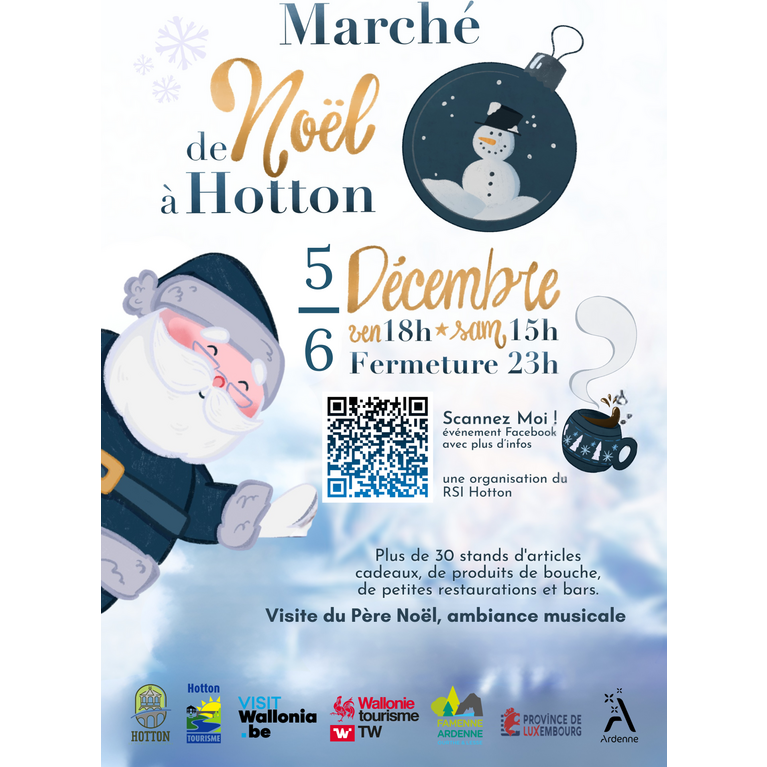 Rendez-vous au marché de noël de hotton ! A tous les amoureux de l'esprit de noël, préparez-vous à plonger dans l'ambiance féérique de notre traditionnel marché de noël de hotton, organisé par la hotton tourisme le vendredi5 et le samedi 6 décembre. Préparez-vous à plonger dans une ambiance féérique pour un week-end : découvrez plus de 30 stands d’artisans, de créateurs et de producteurs locaux, l'occasion idéale de trouver des cadeaux uniques et originaux. Gourmandises et convivialité : réchauffez-vous dans nos bars conviviaux, tenus par les associations de la commune. Un moment fort aura lieu le vendredi soir avec l'illumination du grand sapin. Le père noël en personne sera présent pour rencontrer les enfants (et les grands) et prendre connaissance des dernières listes. Le marché de noël de hotton est le rendez-vous incontournable pour lancer vos fêtes de fin d'année dans une atmosphère authentique et joyeuse ! Un petit extra pour plus d'infos : scannez vite le qr code sur l'affiche pour accéder directement à l'événement facebook et ne rien manquer des détails ! On vous attend nombreux pour faire briller la magie de noël à hotton ! Programme vendredi : 18h00 ouverture du marché de noël 18h30 illumination du sapin en présence du père noël 20h30 - 22h30 fanfare de hotton 23h00 fermeture du marché samedi : 15h00 ouverture du marché de noël 15h30 - 17h30 visite du père noël 16h00 - 17h30 goûter offert par les commerçants 17h30 - 22h photomaton de noël 23h fin du marché de noël informations pratiques vendredi 5 : de 18h à 23h samedi 6 décembre : de 15h à 23h rue du batty à 6990 hotton une organisation de hotton tourisme rue haute 4, 6990 hotton https://www.hotton-tourisme.be entrée gratuite