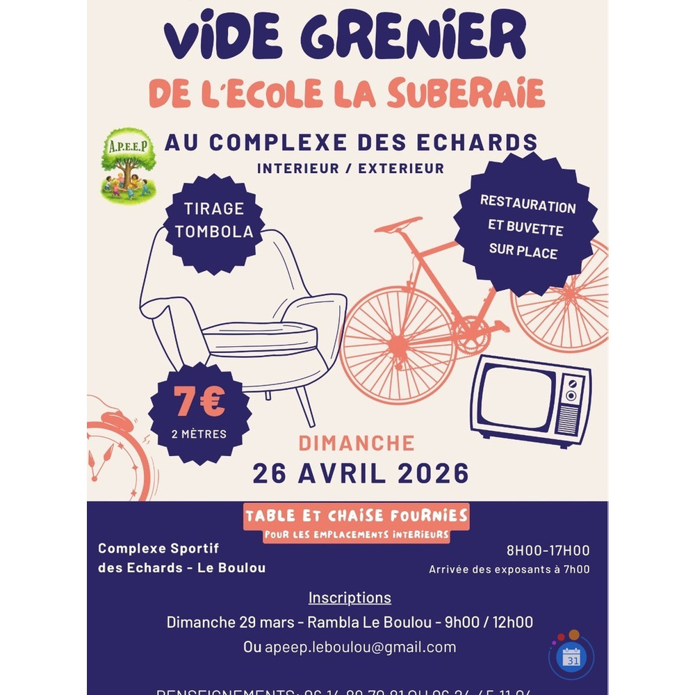 Vide greniersLanguedoc-Roussillon - Pyrénées-Orientales - Le Boulou - 8h - 17h Arrivée exposant à partir de 7h Inscriptions par mail ou sur le marché du Boulou le 29/03 Prix : 7euros les 2m