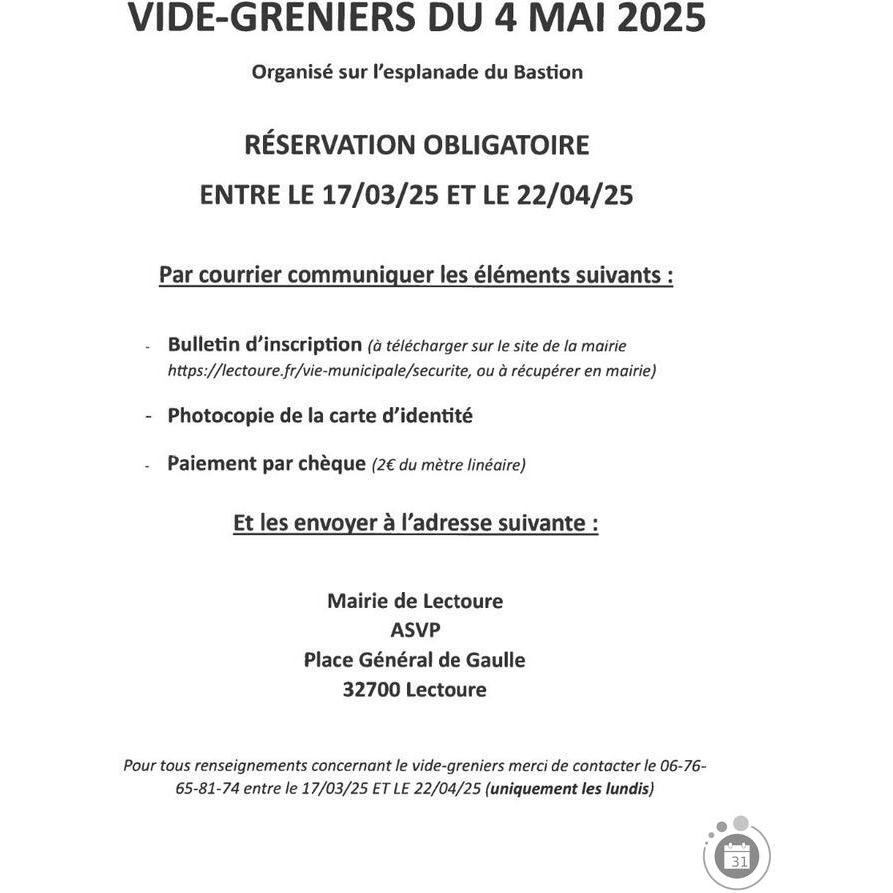 Vide greniersMidi-Pyrénées - Gers - Lectoure - 8 h à 18 h Modalités d'inscription Par courrier à Mairie de Lectoure - ASVP - Place du Général de Gaulle - 32700 LECTOURE en communiquant les éléments suivants : - bulletin d'inscription à télécharger - photocopie carte d'identité - paiement par chèque obligatoire à l'inscription