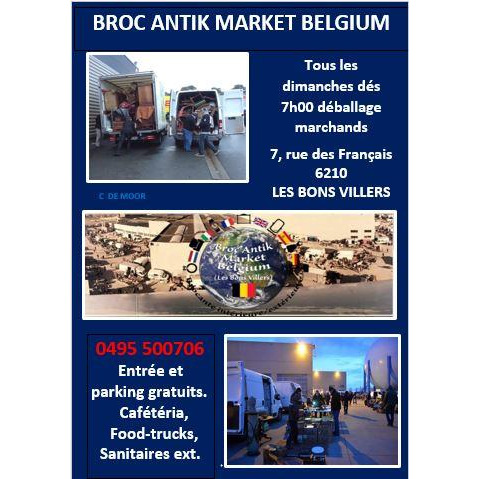 Que vous soyez brocanteurs ,antiquaires ,marchands, visiteurs ou particuliers ,nous vous attendons tous les dimanches de7h00 à14h00 chez broc antik market belgium pour venir vendre, acheter ,chiner et surtout pour assister ou participer au grand déballage hebdomadaire au cul du camion. Cette brocante est devenue populaire et incontournable pour tous le marchands et chineurs en un temps record .Elle est surtout devenue célèbre pour la qualité de ses marchandises.