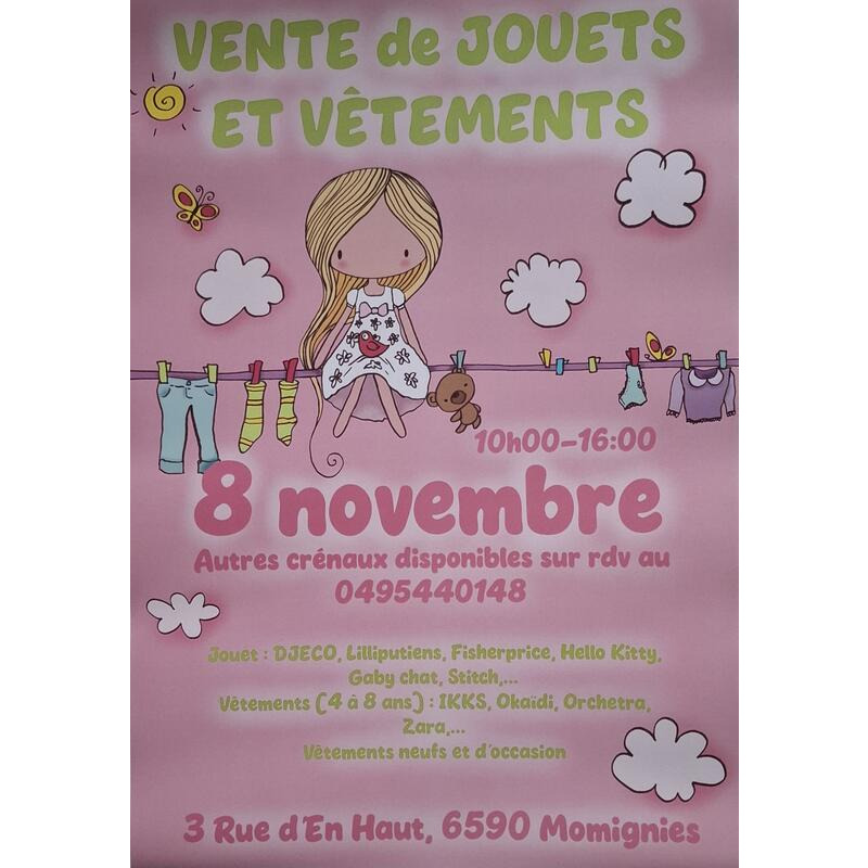 Grande vente de vêtements 4 ans à 8 ans, des jeux, des jouets. Du neuf à demi prix pour les vêtements et du seconde main à prix tout doux.