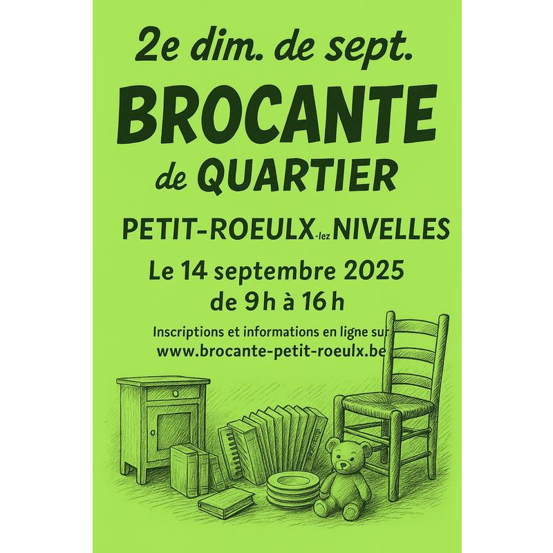 23ᵉ brocante de petit-rœulx quand ? Dimanche 14 septembre 2025 9h00 – 16h00 où ? Au cœur de notre joli village champêtre au programme : – flânerie et bonne humeur – chiner de belles trouvailles – ambiance conviviale et musicale