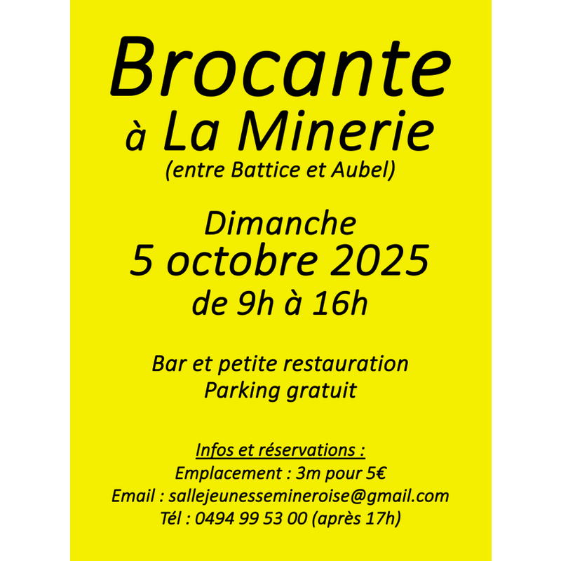 Il est temps de faire du tri dans le grenier et dans les armoires, la jeunesse mineroise t'invite à la brocante annuelle de la minerie celle-ci se déroulera le dimanche 5 octobre 2025 dans le centre du village ainsi que dans la salle de la jeunesse. Bars et petite restauration seront de la partie