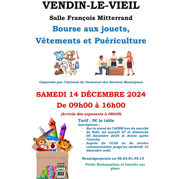 L'amicale du personnel des services municipaux de vendin-le-vieil organise une bourse aux jouets, vêtements et puériculture le samedi 14 décembre 2024, salle françois mitterrand.