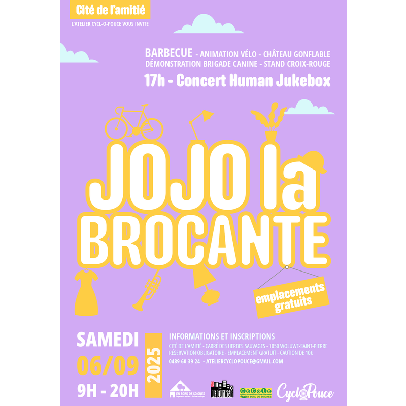 L’atelier cycl-o-pouce et ses partenaires ont le plaisir de vous inviter à leur première « jojo la brocante » au programme : - 09h00 – 16h00 : brocante - 10h00 – 16h00 : château gonflable, grimage, stand animation de la mj bunker, de la croix-rouge de wsp, de l’atelier cycl-o-pouce, prevention truck de la police, de la maison médicale "alliance santé". - 11h00 – 20h00 : bar et barbecue - 11h30 : première démonstration de la brigade canine - 14h00 : deuxième démonstration de la brigade canine - 15h00 : démonstration de capoeira - 17h00 : concert de human jukebox détails des animations: grimage, prevention truck de la police, démonstration de réanimation et désobstruction, coffee with a cop, démonstration de la brigade canine, stand de réparation de vélo, parcours d'équilibre à vélo, château gonflable, etc